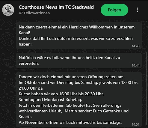 Unsere Gastronomie „Courthouse“ hat jetzt einen Whatsapp Kanal eingerichtet.